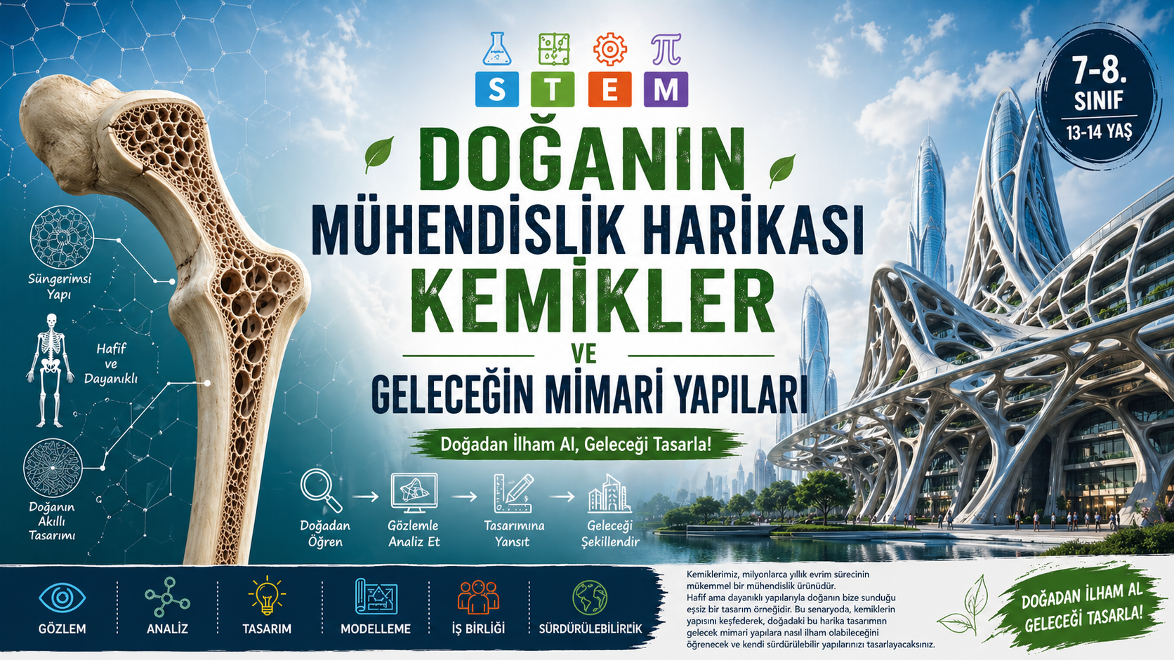 “Doğanın Mühendislik Harikası Kemikler ve Geleceğin Mimari Yapıları” adlı bu STEM öğrenme senaryosunda öğrenciler; kemiklerin iç yapısını, dayanıklılık prensiplerini ve bu yapıların mühendislikte nasıl kullanıldığını keşfedeceklerdir. Gözlem, analiz, modelleme ve tasarım süreçlerini deneyimleyerek doğadan ilham alan yenilikçi çözümler geliştireceklerdir.
